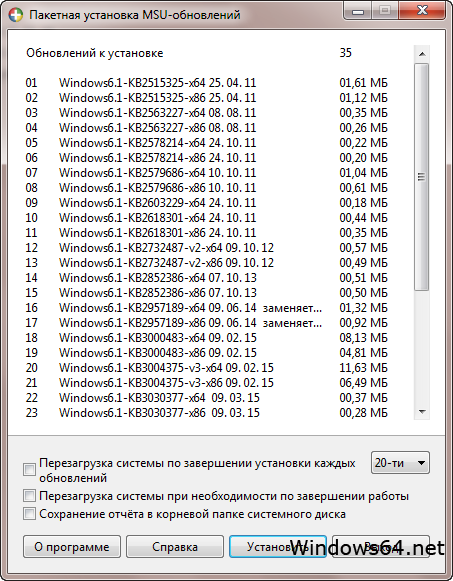 Если вы не продвинутый пользователь, то отрываем папку "Список 1" и запускаем файл exe Пакетная установка msu-обновлений, затем жмём на [Установить]. Установятся рекомендуемые и критически важные обновления для windows 7 64 bit или 32 bit, некоторые exe файлы придётся запускать в ручную. Для определённых условий открываем папку "Список 2". Папка "Дополнительно" – в себе содержит практически необходимые дополнения.
