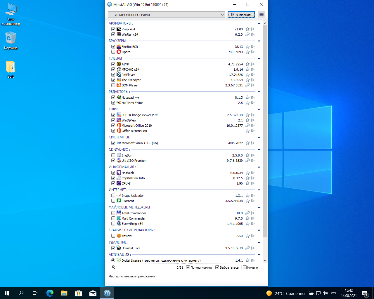-KMS Toolkit – полезнейший набор активаторов. Но хотим отметить, что в сборках AG вопросы активации решены на высоком уровне. На других похожих полнофункциональных сборках у юзеров довольно часто слетает активация Office 2019, на этой сборке – нет.