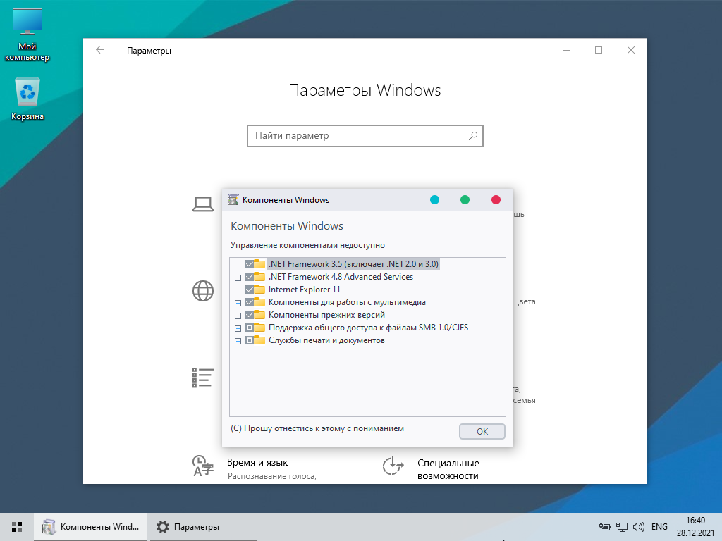Оставлены самые востребованные компоненты. По просьбам трудящихся Den даже добавил Framework 3.5 (вместо типичного твика его замены на Framework 4.8). Сам автор, хоть и не является игроманом, сумел создать идеально быструю для игр систему. Все нужное есть, а если набор компонентов вас изначально не устраивает, то подбирайте другой вариант - можно игровую сборку LTSC. А здесь вы не сможете ни добавить, ни удалить ни один из установленных Компонентов. Так было во всех известных выпусках by Den, и об этом нужно помнить.