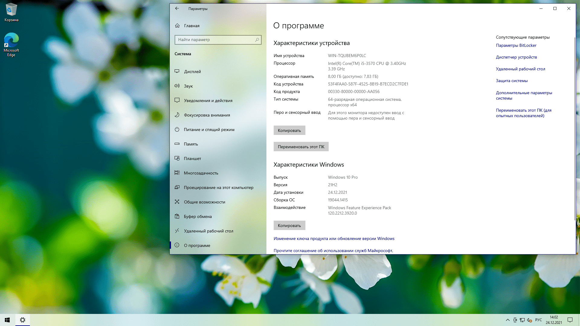 Версия: улучшенная Виндовс 10 (v.19044.1415 - 21H2) Professional