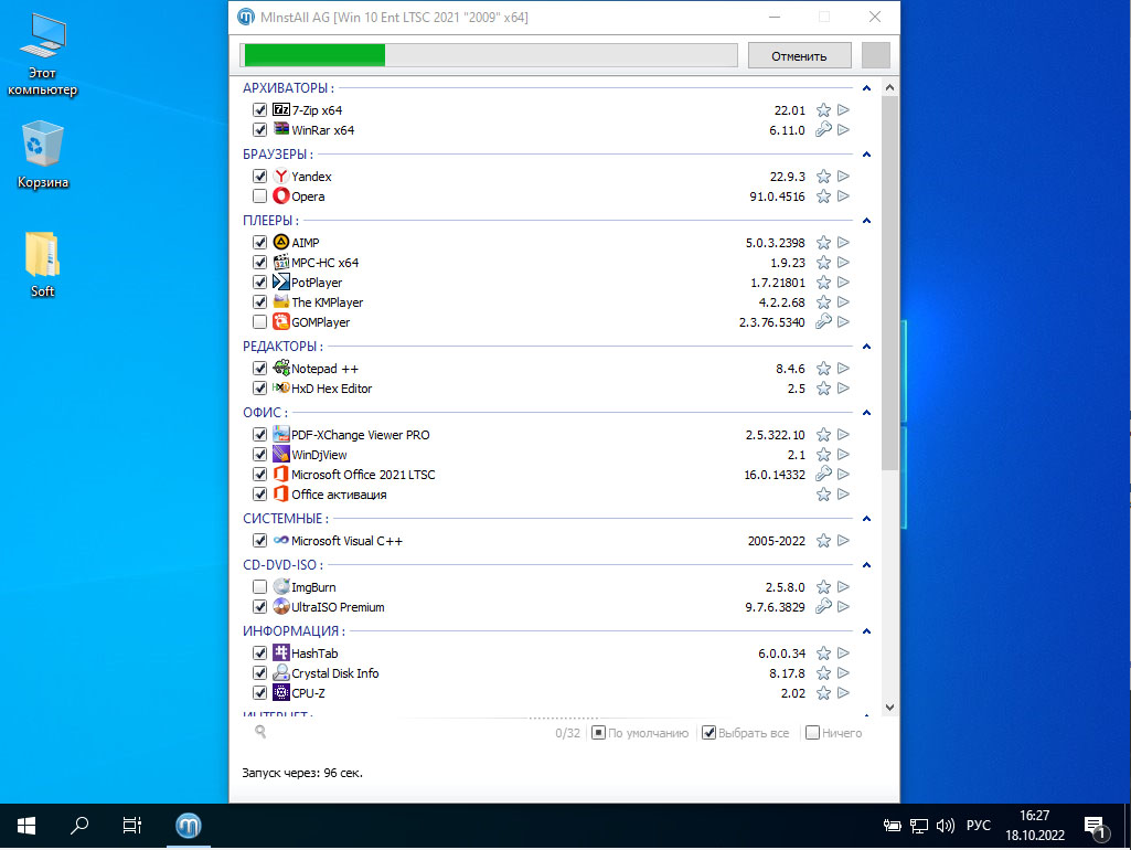Лучший вариант русскоязычной Виндовс 10 на флешку чтоб установить на компьютер, три версии на выбор, плюс программы и встроена активация. Вам понадобится флешка хотябы на 16 Гб и необходимо скачать ISO образ Windows 10 22H2 x64 c USB флешки установить на ПК и ноутбук 9.87Gb торрент бесплатно.Сборка 3-в-1: Windows 10 Корпоративная 22H2 (+ LTSC 21H2) + Pro 22H2 – с различными вариантами установки, а также c WPI (MInstall), с софтом и с Office 2021 LTSC (по желанию). Для каждой редакции (из этих трех) при установке будет предложено 3 варианта: с твиками + Защитником, с твиками без Защитника, а также просто чистый обновленный вариант. Активация вручную, по выбору. Свой или предложенный KMS-активатор можно смело применять ко всем этим редакциям. Если вы решите добавить в систему Office 2021 (из имеющегося WPI по окончанию установки системы), то не забудьте его тоже активировать. Сборка очень удобная, капитальная, не имеет урезок, грамотно настроена. Сборщик AG – профессиональный специалист, он настраивает свои сборки при помощи проверенных авторских скриптов. Вариант Tweak No Defender можно смело назвать оптимальным. В работе данный вариант продемонстрирует лучшую производительность. В LTSC редакциях Магазина не будет (об этом нужно помнить), если он нужен, то проще всего выбрать обычную Enterprise, Pro, либо оригинал Windows 10. Все сборки by AG отличаются высоким уровнем стабильности - поэтому системные администраторы их часто устанавливают на все компьютеры в организациях. Домашние пользователи тоже часто выбирают именно такую полноценную систему.