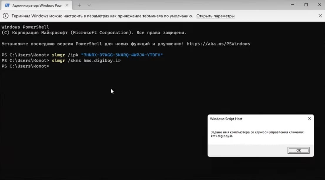 Простая активация Windows 11/10 бесплатным ключом без программ 2023 и без использования вредоносных активаторов. Для пиратской активации Windows не обязательно пользоваться активатором, можно использовать всего 3 команды. Суть этого метода заключается в том, что активация происходит на неофициальном KMS-сервере. Который принимает всевозможные ключи – как лицензионные, так и нет. По такому же принципу действует известный активатор AAct Portable. Сначала он применяет ключ для вашей редакции, затем указывает компьютеру, на каком KMS-сервере осуществить активацию. После этого происходит подключение к этому серверу, который успешно активирует вашу Windows. Конечно, не все доверяют активаторам - из-за того что на них ругаются антивирусы. Но вы можете всегда активировать без активатора с командной строки – тремя командами. Вводите их по очереди в PowerShell или в командной строке (от имени Админа), и в итоге Windows приобретает активированный статус. Такая активация полностью идентична той, которую осуществляют KMS Auto Lite, AAct Portable и многие другие KMS-онлайн активаторы. Никаких знаний вам не надо, просто выберите ключ для вашей редакции, затем запустите эти 3 команды, и успешно активируете без всяких активаторов. Как активировать Windows без активатора в командной строке