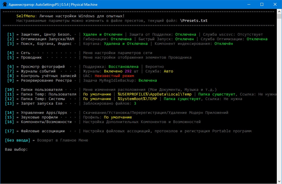 Извлеките скрипт из сжатого zip архива. В папке самого скрипта – обширная инструкция, но ее можно не читать. Запустите AutoSettingsPS.bat (как Администратор), нажмите «0» и «ввод», затем в появившемся подменю нажмите «1». Применятся автоматически все лучшие и рекомендованные настройки.