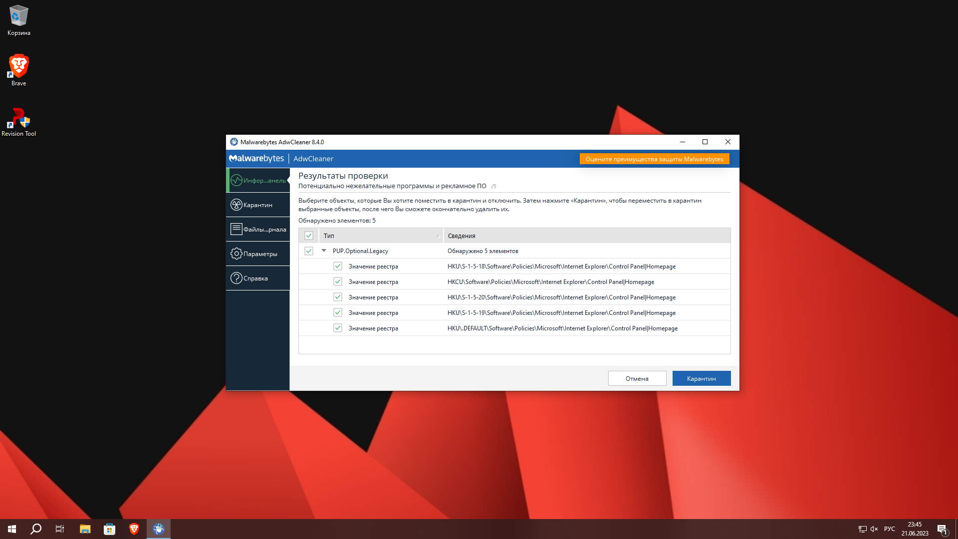 -Почему ругается AdwCleaner? – Потому что стартовая страница IE – направлена на сайт ReviOS.