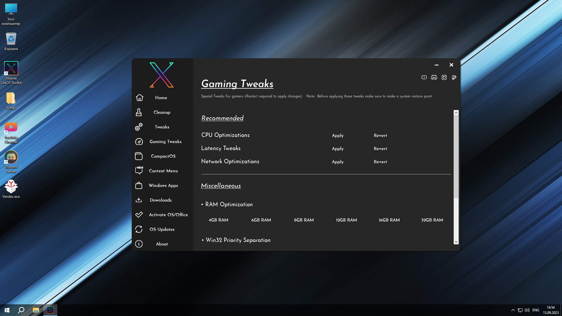 -Наличие авторского твикера (для дополнительной оптимизации). Есть опции для оптимизации RAM (исходя из ее размера) и другие твики для повышения игровой производительности. На рабочем столе предусмотрена также папка Extras с небольшим драйвер-паком.