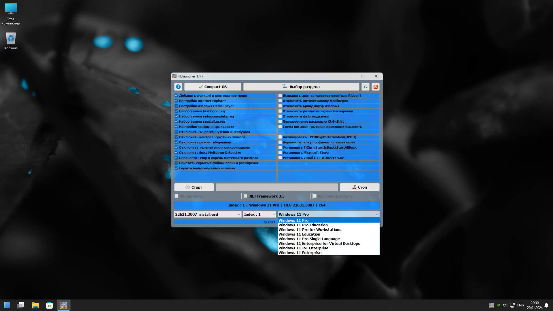 Параметры образа Windows 11 Compact 23H2 Flibustier 22631.3007 лучшая Lite сборка 2024:
