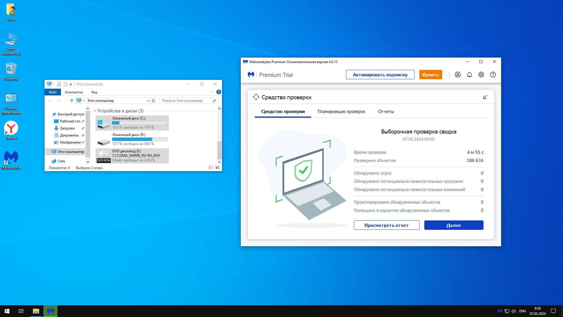 Обратите внимание на малую загрузку RAM при запуске системы (см. на скринах). Потребление на старте 0.8 ГБ – очень достойный результат для актуальной Win 10 22H2. Процессов тоже мало, в общем, в этом плане система безупречно. Однако многие пользователи вообще не заморачиваются небольшими различиями в цифрах (и плюс к этому часто являются обладателями мощных ПК). Но те, кто экономит RAM, бесспорно будет доволен этой сборкой. Конечно, старые версии более экономичны, но актуальная Win 10 22H2 – самая высокотехнологичная среди всех «десяток», и для игр она тоже оптимальна. В ISO образах допускается установщик браузера и некоторые пользовательские изменения по умолчнию для браузера Chrome, каждый может без проблем изменить настройки браузера на свои предпочтительные. Все авторские сборки перед публикацией на сайте, проходят проверку на вирусы. ISO образ открывается через dism, и всё содержимое сканируется антивирусом на вредоносные файлы.