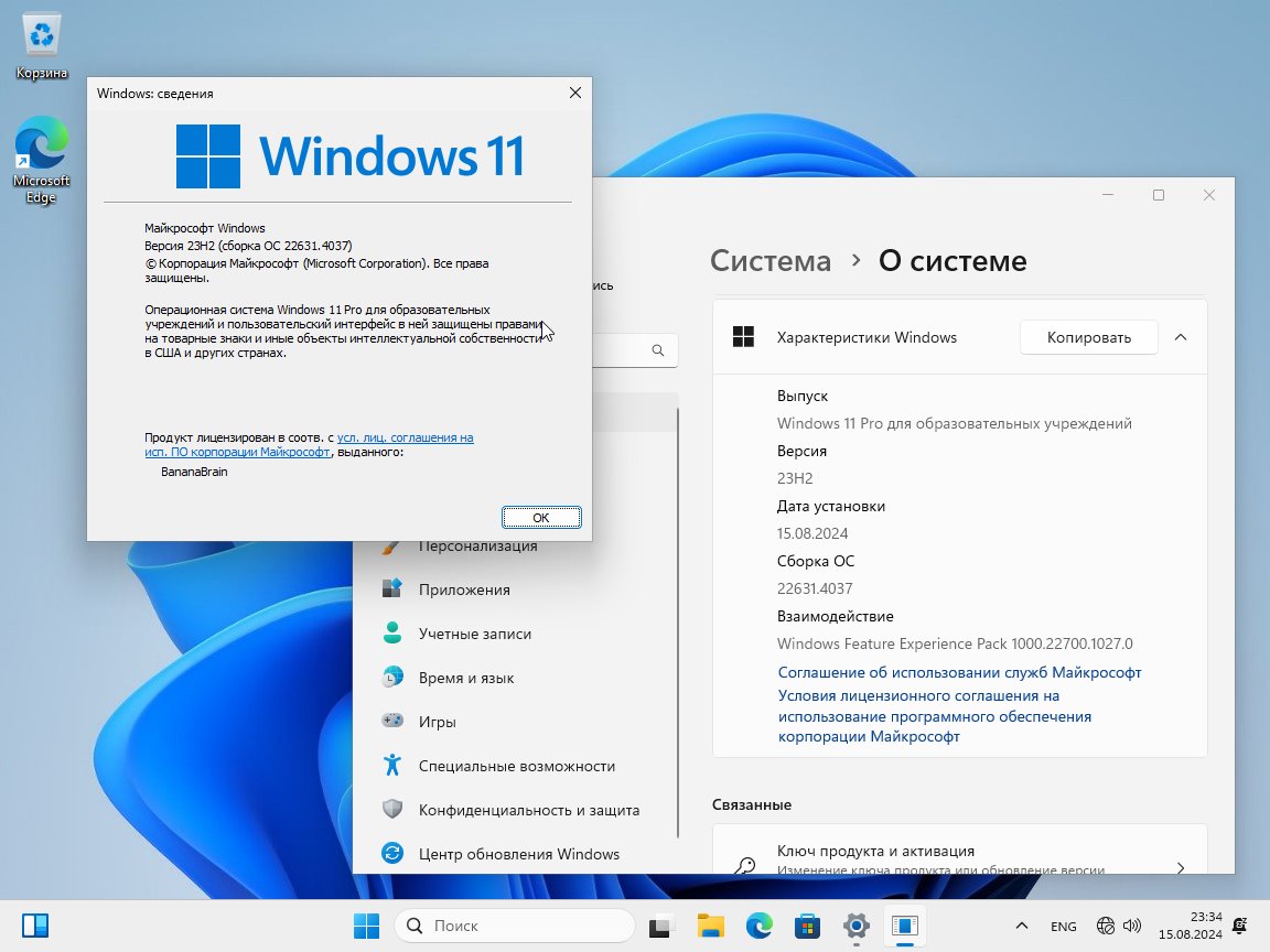 Для ознакомления скачать Windows 11 все версии в одном ISO (11in1) 23H2 10.0.22631.4037 на русском от OffBananaBrain через торрент. В образ системы были включены все актуальные обновления по состоянию на 13 августа 2024 года.Система не запускалась в режиме аудита, что подразумевает при создании сборки не проводились дополнительные настройки или установки приложений. DISM использовался для установки обновлений, очистки временных файлов, активации локальной учетной записи, а также для отключения проверок оборудования. WimLib-Imagex: Применялся для сжатия файла install.wim в формат install.esd, что позволяет уменьшить размер файла установки. Oscdimg: Программа для создания ISO-файла, содержащего подготовленную сборку.