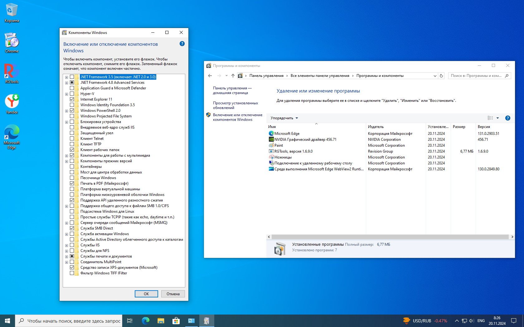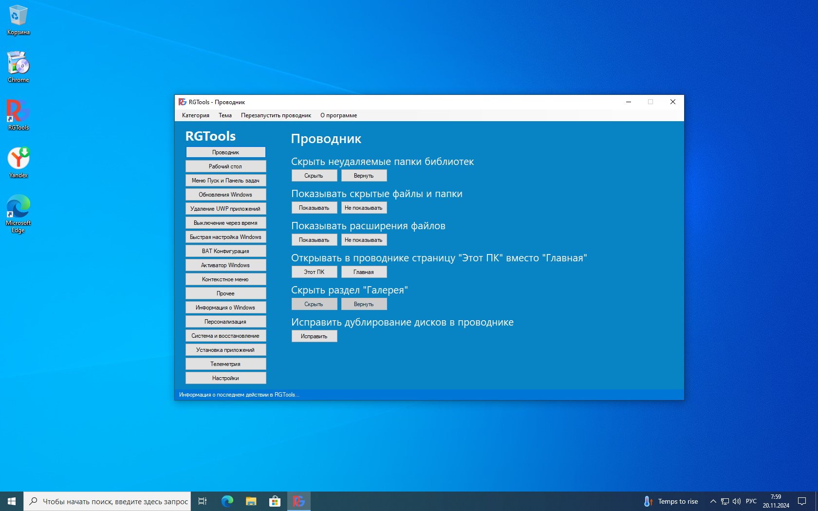-Добавленное ПО: твикер Revision Group Tools (автоматически устанавливается при установке Виндовс). На рабочем столе – установщики официального Хрома и Яндекса (при этом браузер Edge не вырезался – поэтому на выбор пользователя – будут изначально сразу три самых популярных браузера).