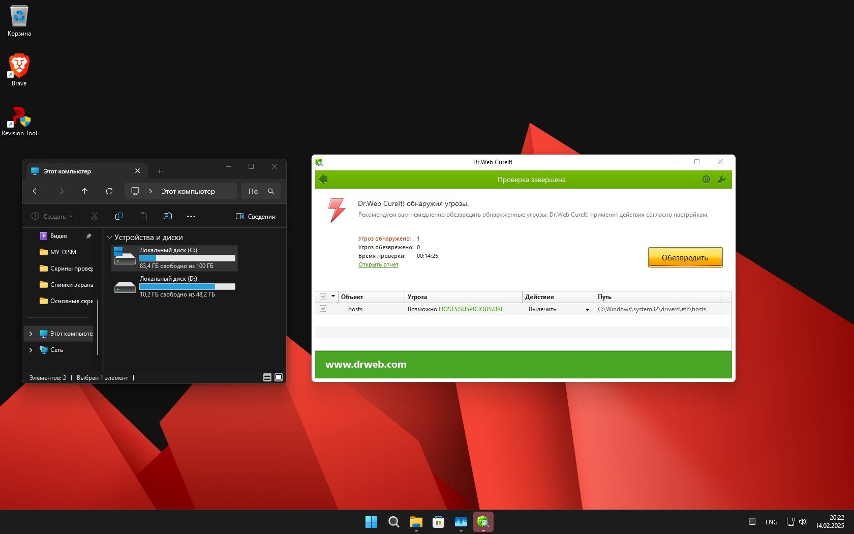 - CureIt недовольна измененным файл hosts. Для справки – CuriIt всегда ругается, если файл hosts изменен. Мы его открыли и посмотрели, там просто добавлен список тех URL адресов, на которые винда сливает телеметрию (чтобы не сливала). В общем, это полностью ложное срабатывание CureIt, т.к. файл hosts в данной сборке безопасен.