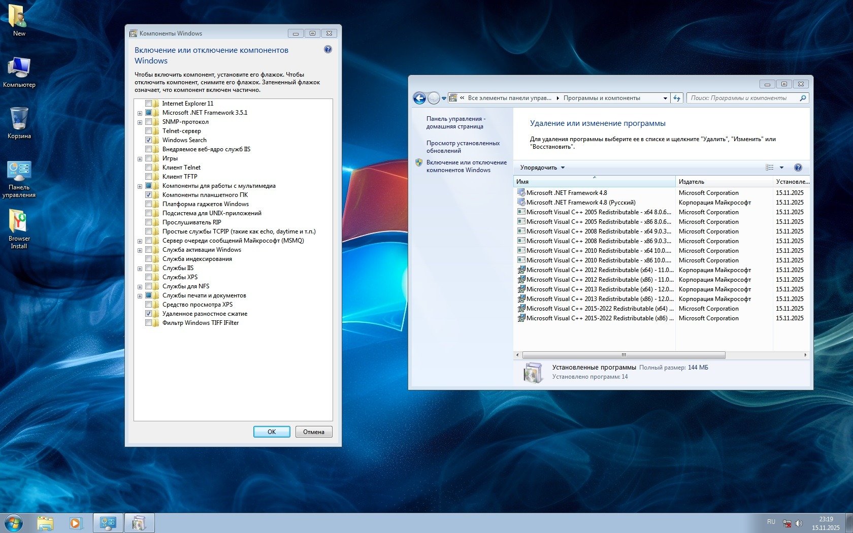 Удалены устаревшие элементы: IE11, Media Center, DVD-студия, гаджеты, XPS-компоненты