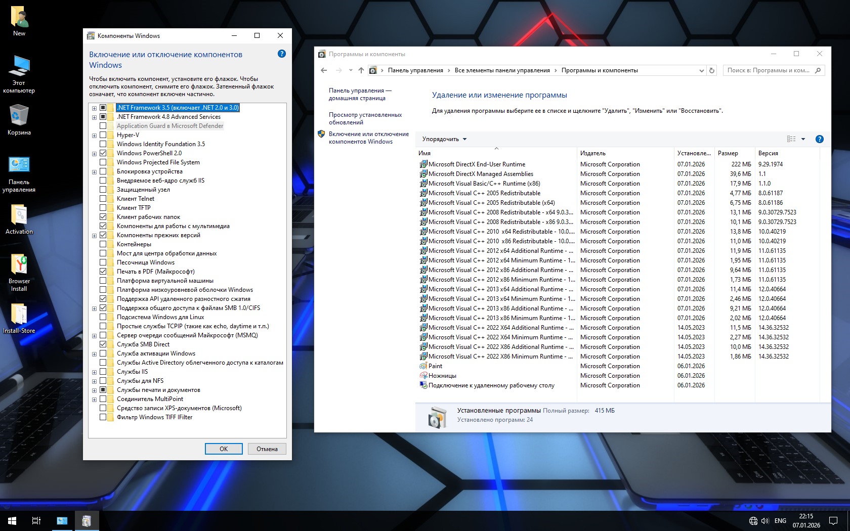 -В Компонентах Windows дополнительно включены Framework 3.5 и некоторые другие компоненты. Их состав легко поменять по своему усмотрению.