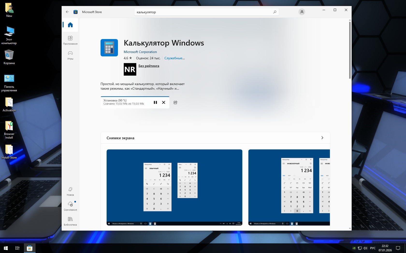 -Гибернация отключена, Просмотрщик фото разрешен, Калькулятор классический (новый можете скачать из Магазина). По умолчанию Store в системе, но добавлен очень надежный его установщик на рабочий стол.